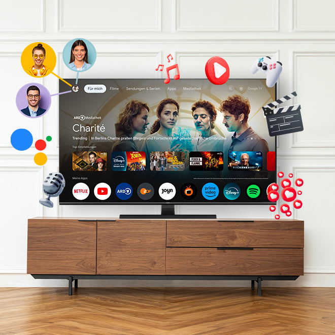 Mit Google TV haben Sie die Möglichkeit, zahlreiche Apps herunterzuladen und Tausende von Filmen, Sendungen, Musikstücken und sogar Spielen zu genießen. Apps wie Disney+, Netflix, YouTube, Amazon Prime Video, Apple TV, Spotify, YouTube Kids und viele mehr sind auf Vestel Google TVs verfügbar. Im Gegensatz zu Android TVs können Sie bei Google TV zudem für jedes Familienmitglied ein eigenes Benutzerprofil erstellen. Durch das spezielle Profil, das Sie für Ihr Kind anlegen können, haben Sie die Kontrolle über Apps und Inhalte und können sogar einen Schlaftimer für Ihr Kind einstellen.